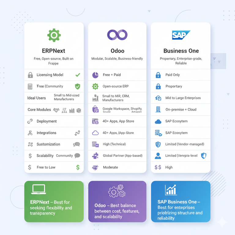 Here’s the takeaway: ERPNext is best for teams with technical resources; Odoo fits companies that want easy customization and a clean UI; SAP Business One suits larger operations that prioritize structured vendor support.